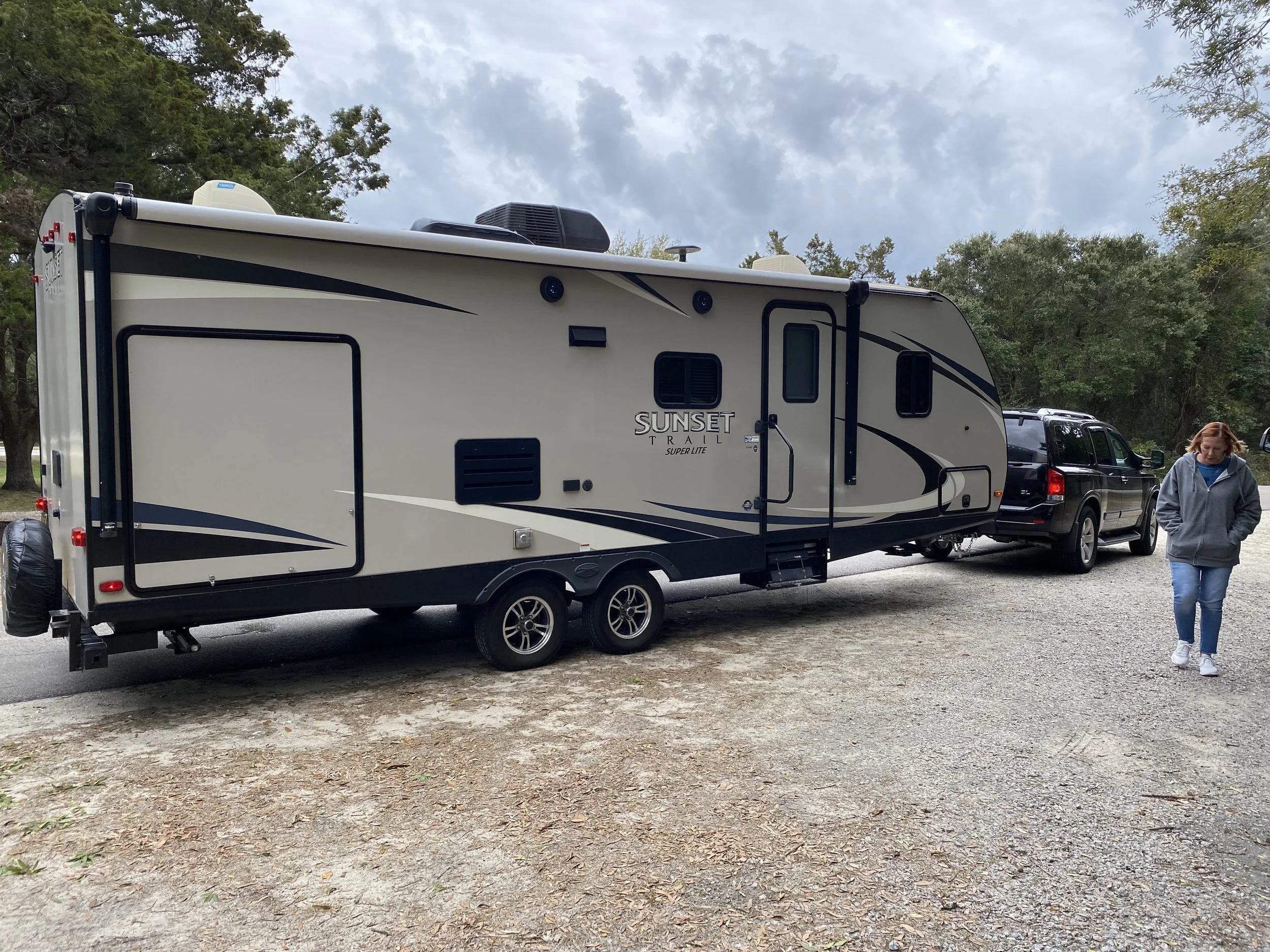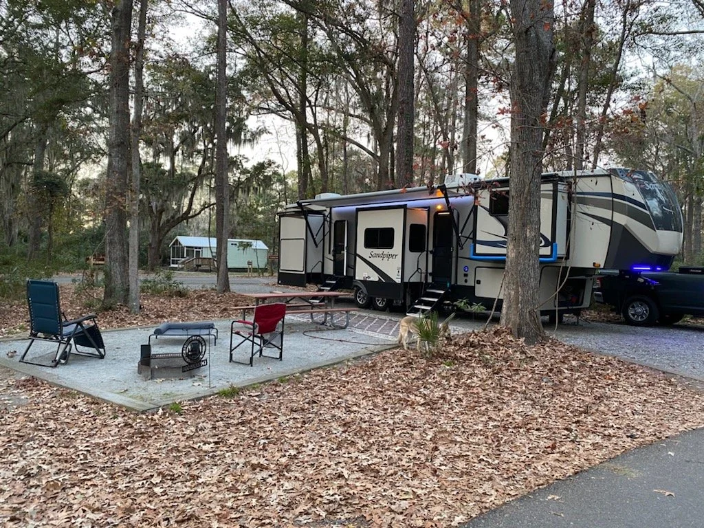 We got up and moving around 8:30 Ideally we wanted to be packed and loaded and leaving Huntington Beach by 10 ish. Took us longer than we anticipated. 11:00 we were on the road. Uneventful trip. Took US 17 to Charleston, picked up I 526 around Charleston and then back on US 17. Just north of GA we hopped on I 95 and took it down to Exit 94 and then GA 204 to Skidaway State Park. I did have to hurriedly brake for a red light but did so from a slow speed. No problem. We arrived and checked in at the office. Everyone was busy so they showed us where to set up and said someone would be visiting us tomorrow.
