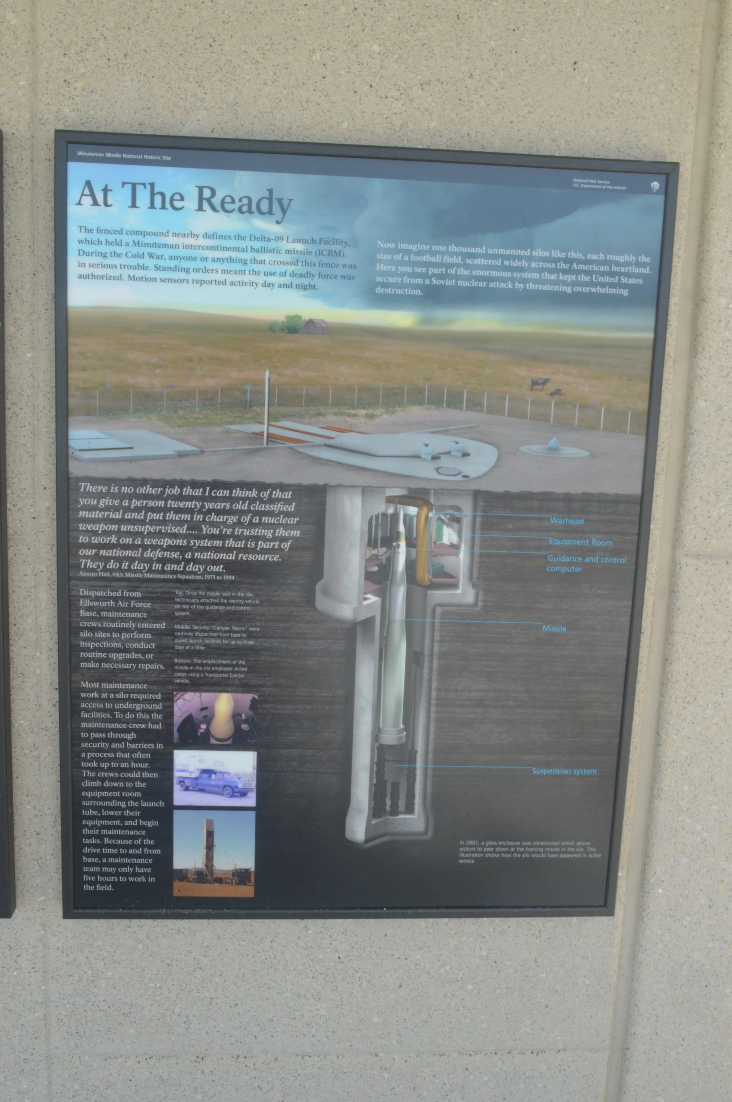 For today’s adventure we are heading back to the Badlands and surrounding area. Our first stop is Badlands Harley Davidson. This is the last of the Harley dealers in the area. I said I wasn’t going to buy a shirt but they had the coolest design that I couldn’t resist. The next stop is Delta 09 Minuteman Missile Site. This is an actual missile silo used during the Cold War. It had a missile sitting in the silo. The ground cover was slid away so you could see how it was. There is a clear dome over the silo so you can see down inside. It was very interesting to me. This is an era that I grew up in. This is one of three sites that tell this story. The second site is Delta 01 where you actually go down into a silo to see the Ground Control Room. I called too late and we could not get a reservation. They were closing by the end of September. The third site is our next stop, the Minuteman Missile National Historic Site Visitors Center. We had briefly stopped here before but Nancy did not go in and I didn’t sit and watch the movie. The movie actually told the story of the Minuteman sites and how they were manned and launched if necessary. It was very interesting to hear about the “close calls” we have had through the years. It really reminded me of the movie “War Games”.