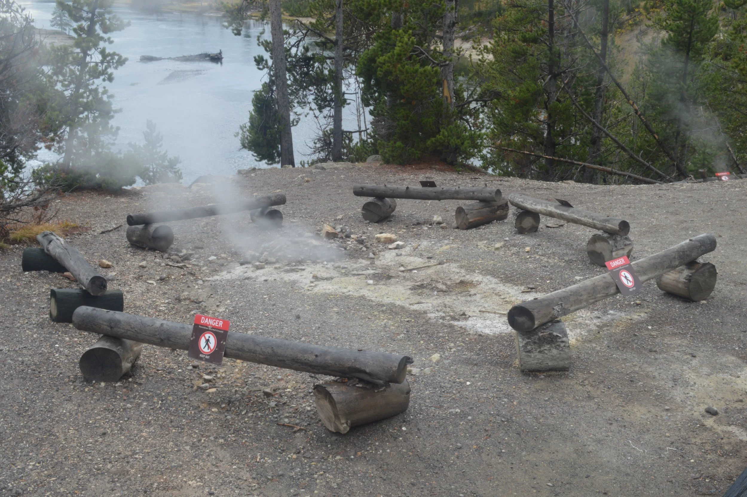 This is Day 3 of 3 at Yellowstone. Our plan is to travel from the bottom right of the “8” to traverse the entire upper circle. Again we saw a couple of elk cows dining along the roadside. Our first stop is Roaring Mountain. In May of 1988 a lightning strike started a small forest fire. By the end of the day it was extinguished. This is quite common. However, the summer of 1988 became very dry. This became known as the Summer of Smoke. Between June and September 50 fires had burned the forests of Yellowstone. Drought conditions, dry lightning, high winds all contributed to the destruction of Benson Peak. The fires were smothered on September 11, 1988 with a heavy snowfall and continued to smolder thru the remainder of the year.