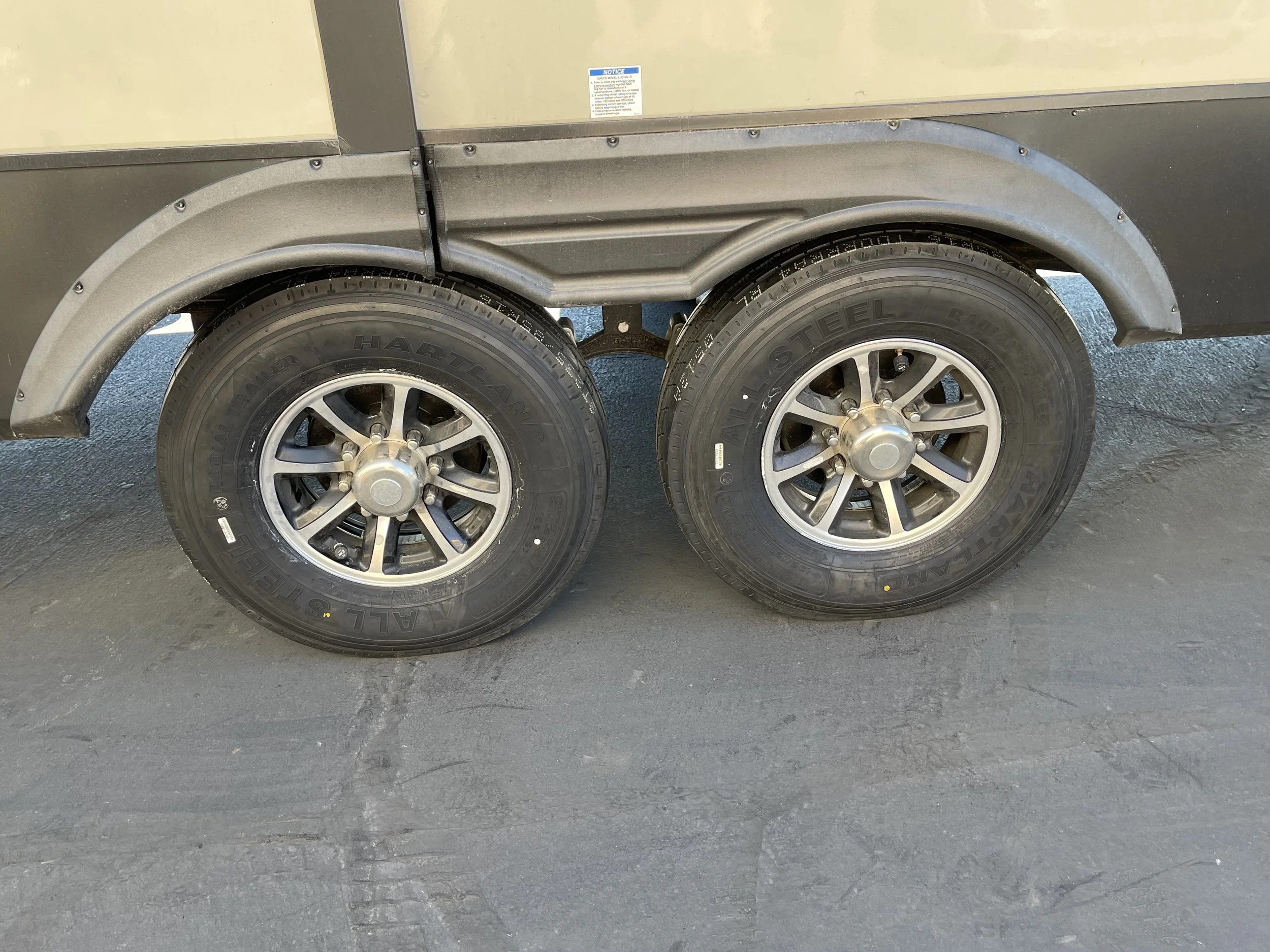 We have a spare, an air compressor, an air impact wrench, etc. We set out the emergency triangles. Then I remembered that we have a roadside service contract. I made the call and they called back in about 5 minutes and said they had a local contact that would be at our location within 60 minutes. The young lady on the phone was very polite and courteous and concerned about our safety. The company arrived. It was Solomon’s Service. While we waited, we had to take half the things out of our basement to get to the spare. We did so while waiting. We also removed a small piece of the fender skirt that was damaged. Then we got out our camp chairs and headed about 150 feet from the RV and set up “camp”. We had a beautiful view. The weather was awesome. Even grabbed a drink out of the fridge of the outdoor kitchen.