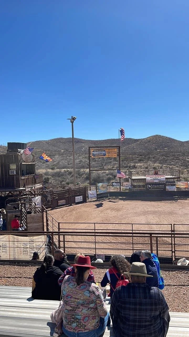 We had purchased general admission tickets for bull riding at the Tombstone Shoot Out Arena. The weather was absolutely beautiful. There was a slight breeze, sunny, and temperature was around 68/70. The bull riding started at 2:00PM. It was really cool. The announcer was fabulous. The action was great. Saw some great action. Definitely want to go to more rodeos and bull riding in the future. My favorite part of the bull riding is the bull fighters. We used to call them “rodeo clowns”. They are fearsome, athletic and courageous. One tradition at a rodeo/bull riding involves the children. They are invited into the arena. Then they have to take off their shoes and create a pile of shoes on one side or middle of the arena. Then, while barefoot or sock feet, they go to the other side of the arena. When given the “Go” signal, they run to the pile and find their shoes and must put them on and then run back to where they started. Now that is expected. But this announcer took the children to another level. He had them warm up first, like doing push ups in the dirt. Then, he had them lie on their bellies and then roll right and then roll left. Then he told them that they should take a handful of dirt and put in their pocket as a souvenir and if they didn’t have pockets, their socks, etc. The majority of the crowd was laughing hysterically. I’m sure some parents were not.