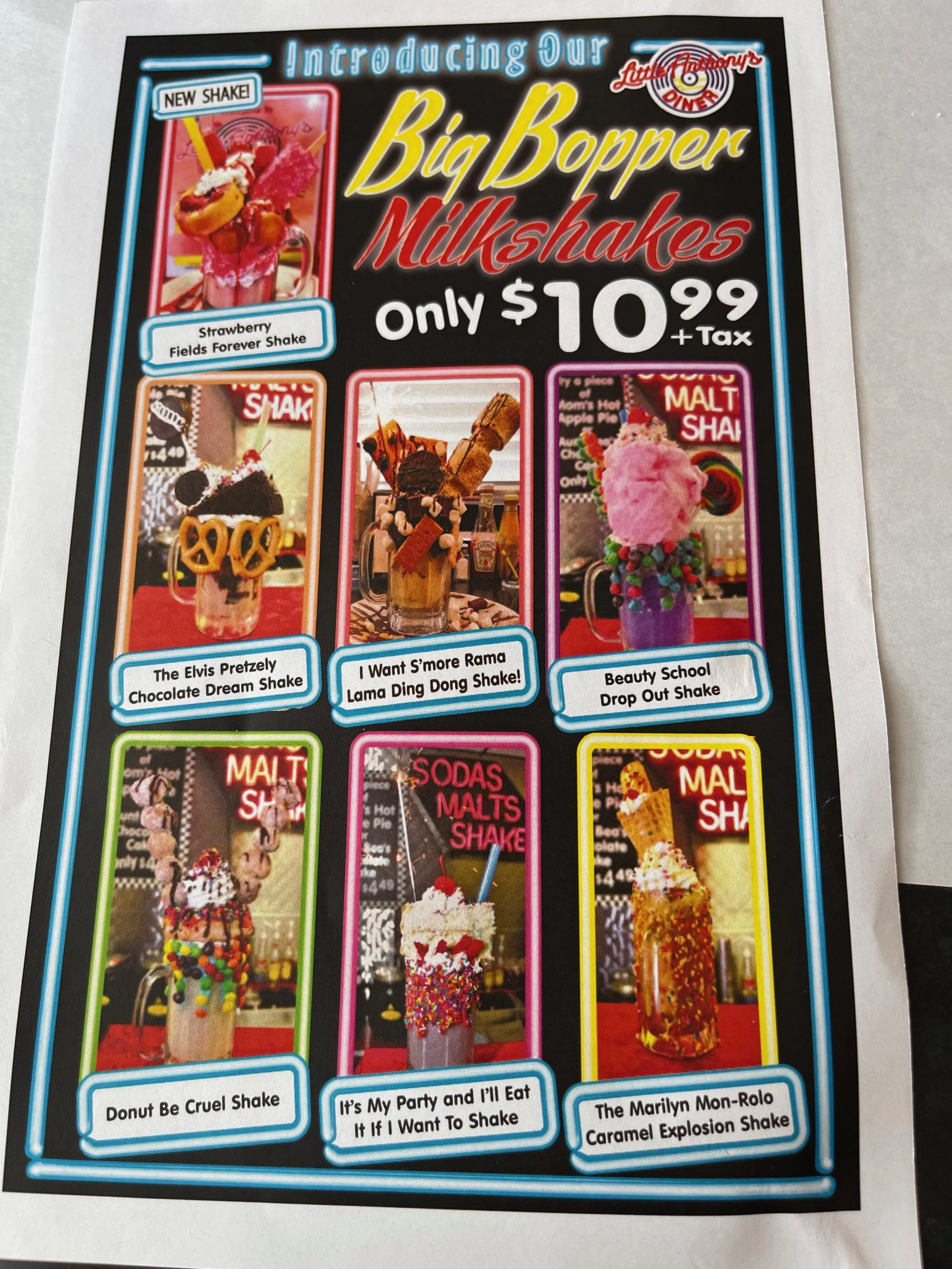 Today’s adventure is going to the Boot Barn to pick up my boot which I had to have stretched. While we are there we decided to eat lunch/dinner at Little Anthony’s Diner. It is a 50s themed diner. Outside they have several old cars. The one that caught my eye was a 1964 Volkswagen Bug. It reminded me of the 1963 Bug I had when Nancy and I were dating. I had the Blue Plate Special of open-faced roast beef sandwich with gravy with mashed potatoes and gravy and green beans. Nancy had a Rueben sandwich that came with french fries and had a side order of Fried Mac N Cheese. We shared a “Full” milkshake. The food was very good and the shake was wonderful. They also offered some exotic shakes that looked extremely decadent. They also offer up car shows, live entertainment on certain days. Very cool place. Check it out here: Little Anthony’s Diner