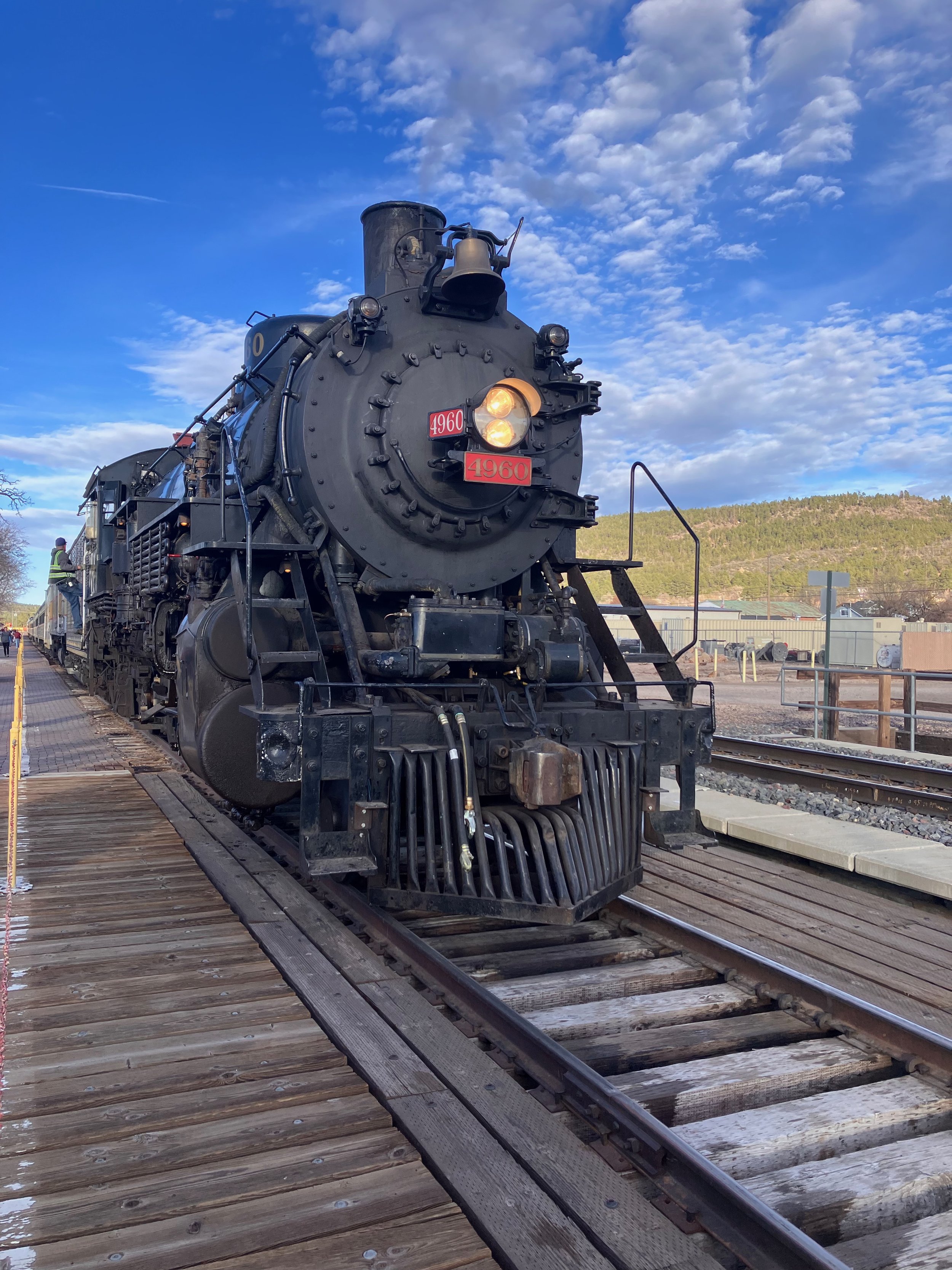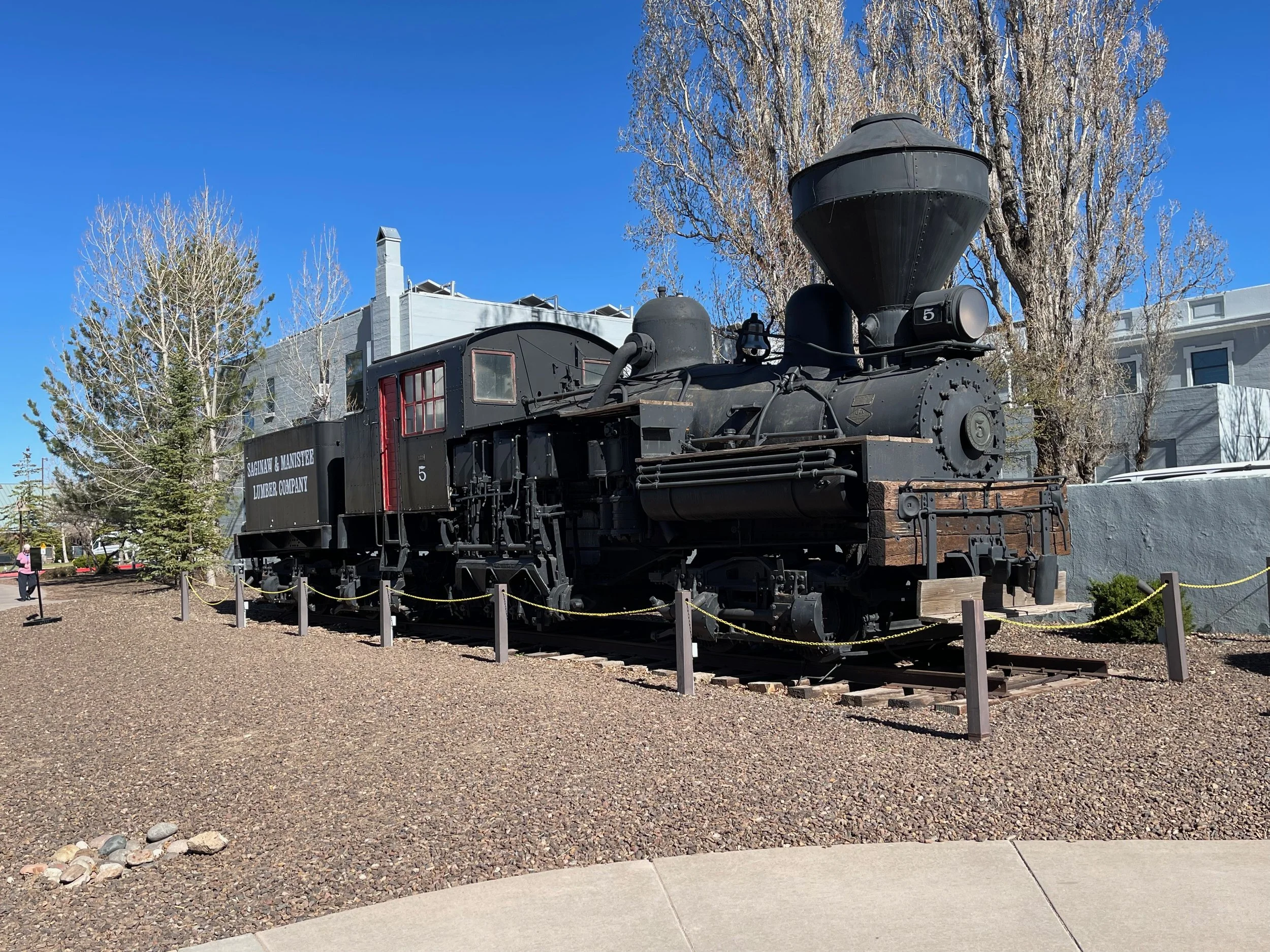 We finally arrived at the Grand Canyon Railway and RV Park and set up. Nancy and I attempted to get our boarding passes for Saturday’s train ride into the Grand Canyon. However they will not be available until tomorrow after 12:00 noon. Very cool steam train on display outside the gift shop. Later that evening Wayne and Jen, another high school friend of mine and his girl friend, were meeting up with us to explore Williams and the Grand Canyon together. After getting the RV opened up we discovered many things had fallen and had become displaced. We did get lucky in one respect. This morning I had used the bathroom and I had closed the door so Ashes wouldn’t run in there and hide under the laundry closet. He had a tendency to do so when it’s travel day. However, neither Nancy nor I double checked the bathroom. Usually when we travel, if a door is closed it means that everything is secured and ready to go. Well not today. The laundry closet door was just bouncing around unsecured and 2 screws came out of the track. That was not big deal, I put them back in the door in new wood. Then we got real lucky as the glass shower doors were not secured. No broken glass. Whew!! A few bottles of shampoo, etc. got bounced around but nothing broke. The biggest tragedy was our Emeril’s Air Fryer bounced off the counter. The handle bent but was easily straightened. A couple of small plastic pieces broke off but I believe it will work okay. Never had any issues before but the roads were rough. Glad to be stationary for a few days.