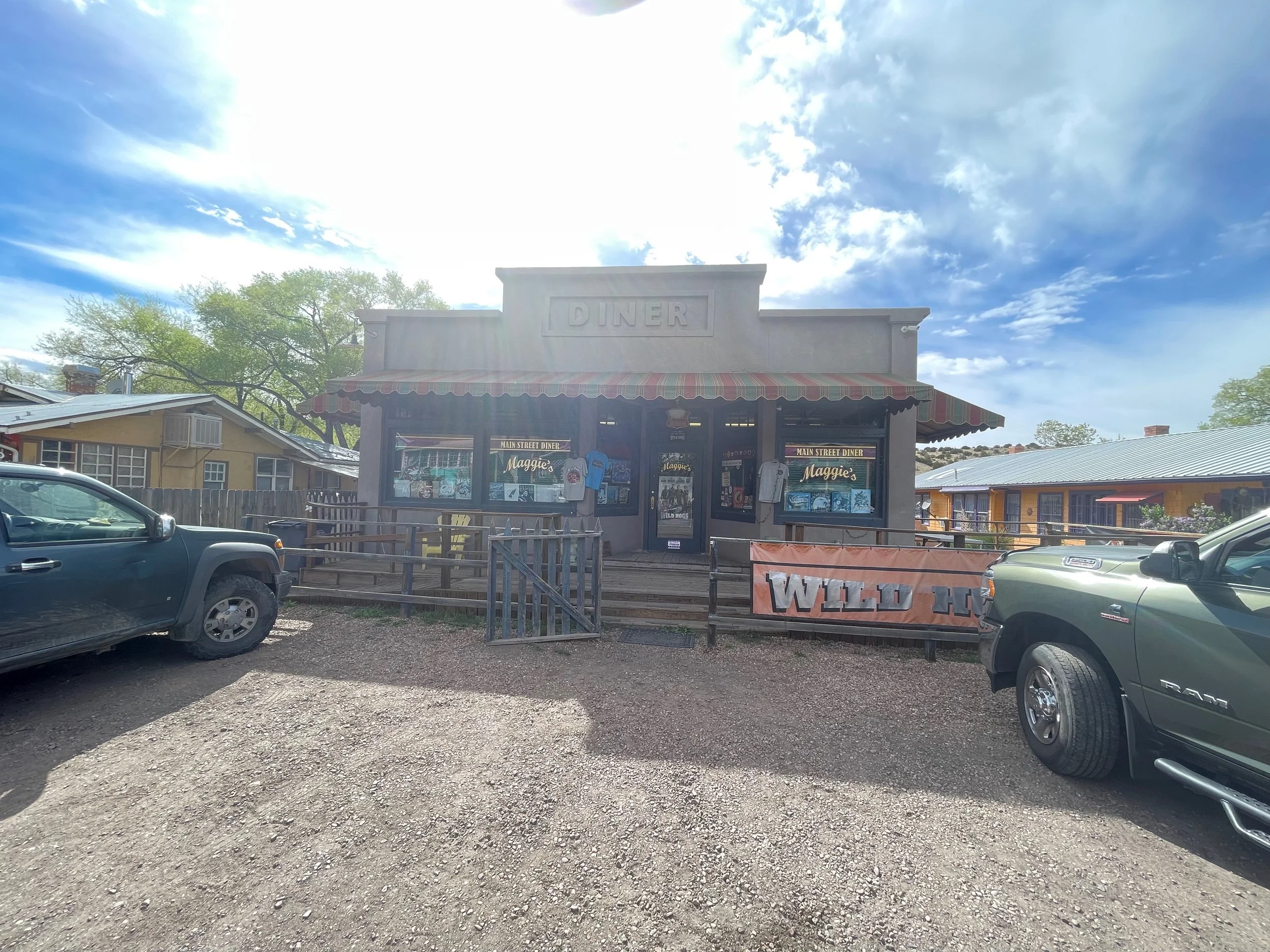 Back on the road again this morning. Our next stop is only a short distance away at Rancheros de Santa Fe Campground. We arrived and got checked in. We found our site and set up. The plan is to take a drive thru the New Mexico landscape and find Madrid, NM. I wanted to visit the town and Maggie’s Diner. The reason is it is a part of one of my favorite movies, “Wild Hogs”. Maggie’s Diner was built just for the movie and is not a diner at all. It is strictly a tourist souvenir destination. I tried to find a shirt but it took about 4 tries to find one in my size. I did finally find one. I also found poker chip and a patch for my leather vest. I have a few patches that will need to be sewn on it. We left Maggie’s Diner and headed back to our campsite to prepare for tomorrow.