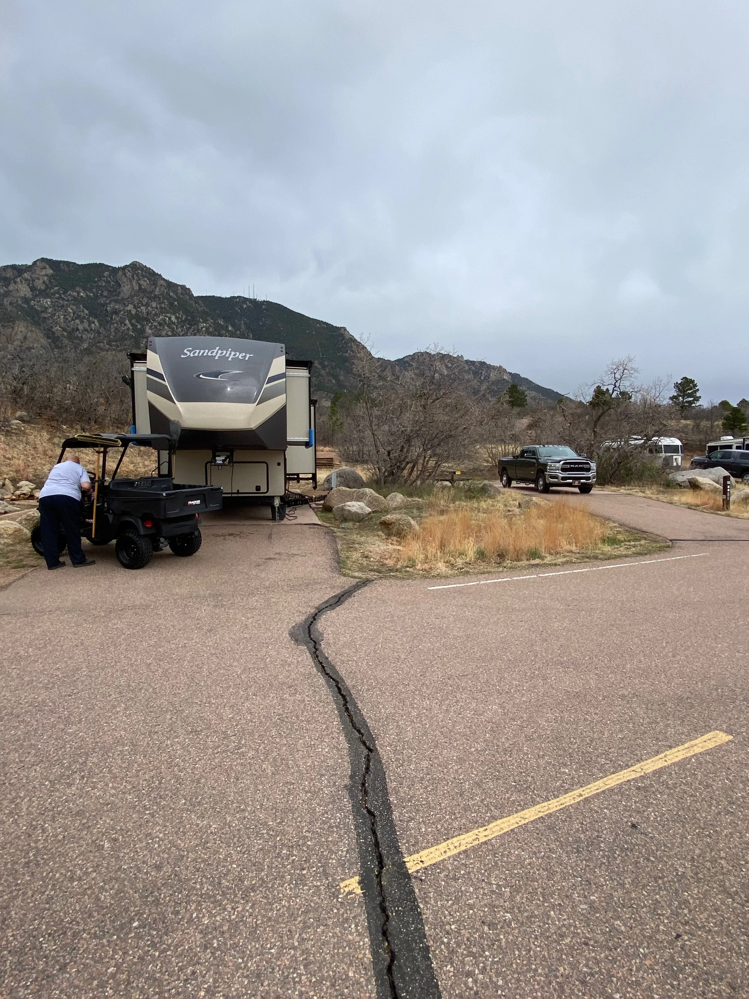 We have a weather station in the bedroom and it tells us the temperature, time, and humidity inside and outside. Normally we put the sensor on top of the wheels on the door side of the RV. It protects it from direct sun and from precipitation. Well, this morning I left it on the wheel. And obviously there was little hope of it surviving. Additionally, we were not going back to retrieve it even if it had survived. We arrived at Lake Pueblo and was not aware of the procedure for Colorado. We made our way to the Visitor’s Center. Just ahead of us was another fifth wheel. He did not know the procedure either. His wife had already went into the Center so we awaited the word. We found out that you go toward the campground and there will be a gate there. You will need to purchase your day pass for each day you are in the park. The cost is $10 per day. We were following the other fifth wheel. He pulled in and stopped and made his purchase. We were just behind them. We had to veer right slightly to go through the entrance lane. As the leader was pulling away, I happen to look up and notice a sign that said “Clearance 12 Feet”. I was hoping this was a mistake as our rig is 13 feet 5 inches high. I slowly pulled forward as Nancy had gotten out to spot. I was able to reach the Ranger window and they did confirm that it was indeed on 12 feet high. Nancy also confirmed that there was no way. The person in the gate house called for a Ranger to come down and direct traffic.