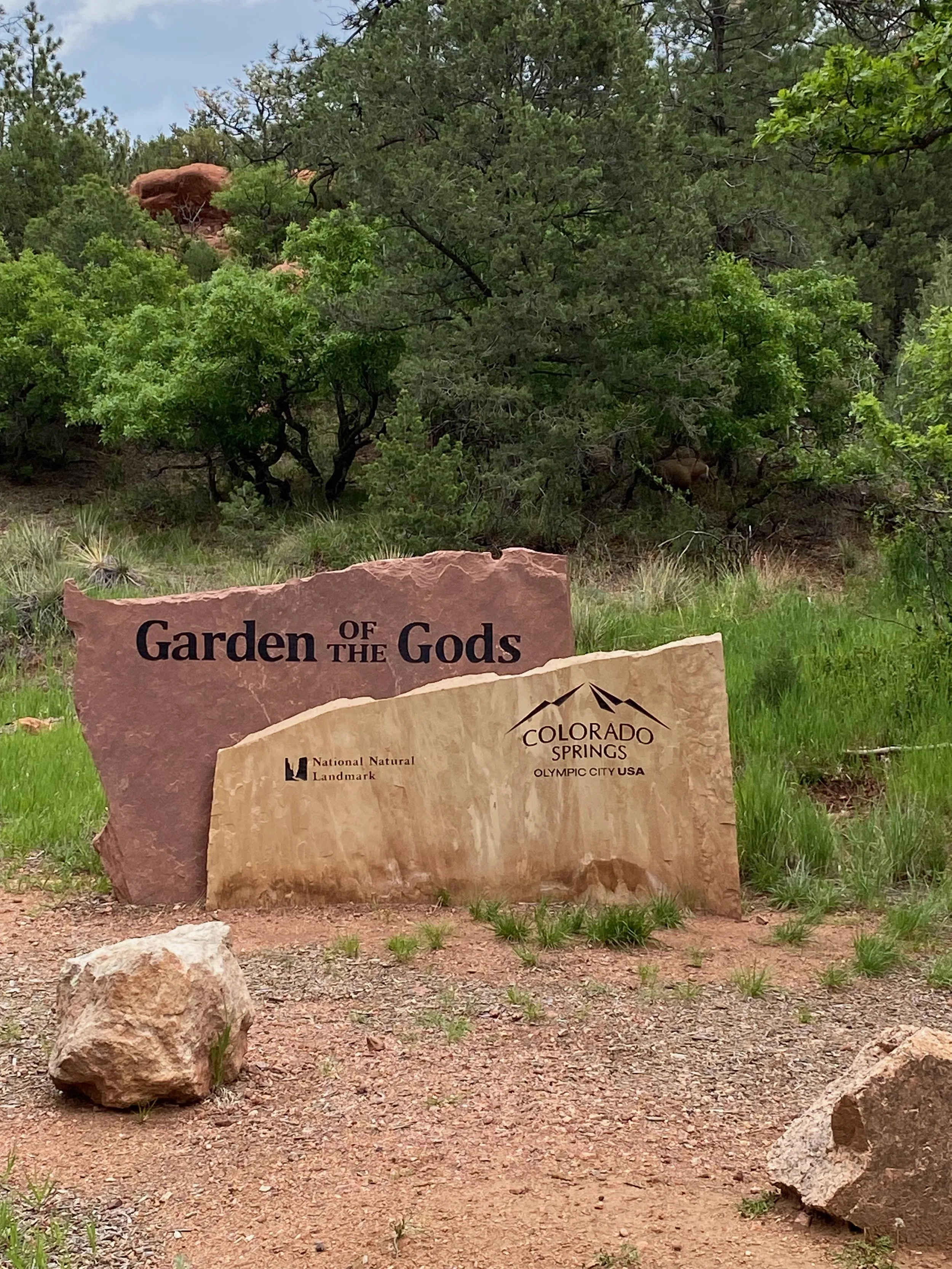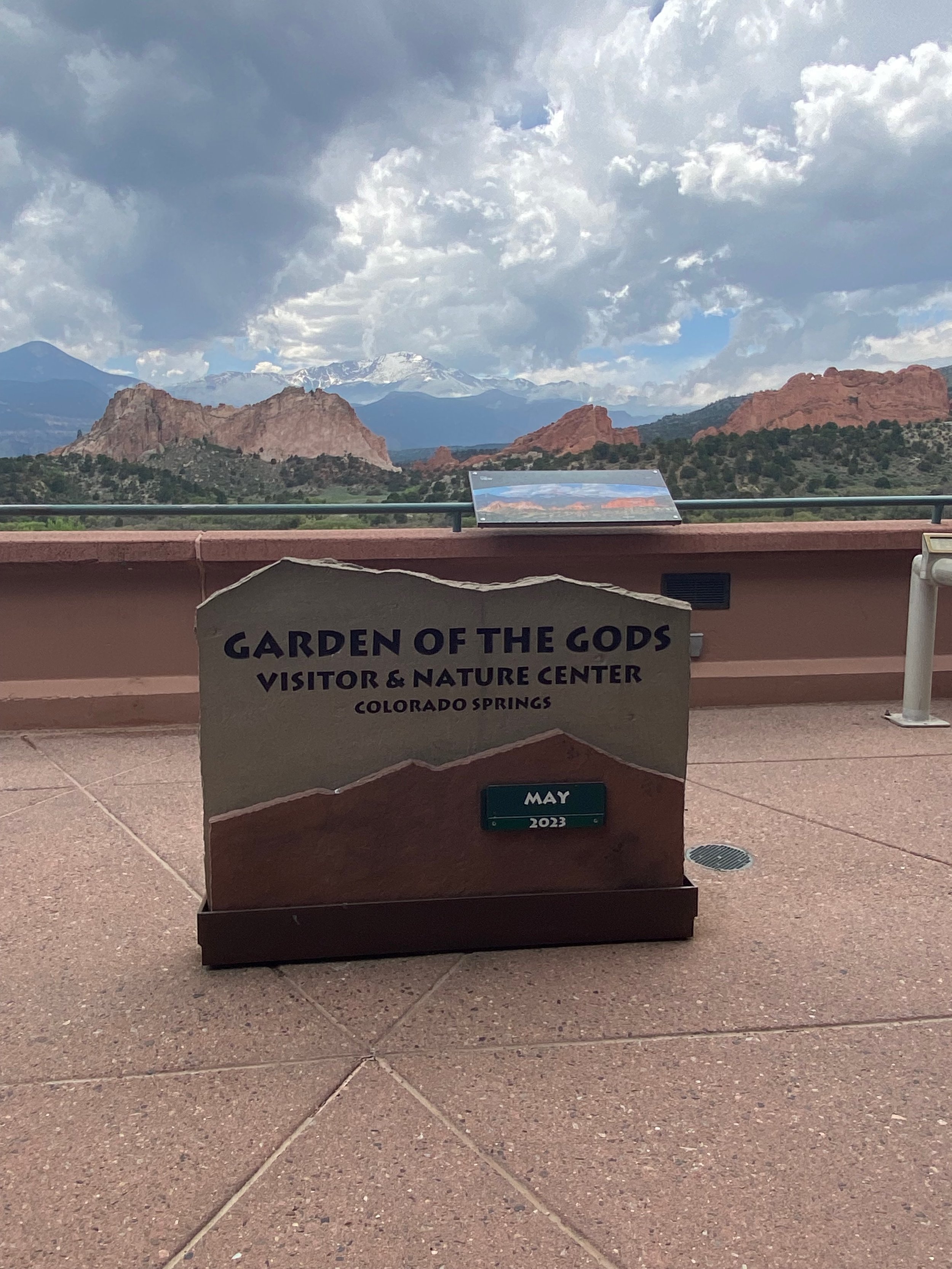After the bird incident we went to The Garden of the Gods. It is located at the base of Pike’s Peak and is totally free. The Visitor’s Center has a lot of great information and displays. They also offer an excellent 12 minute video for $6. It is well worth the cost. It explains in a very entertaining way how the formations were created and the billion years of how it came to be. After the movie we entered the park to start our tour. We got to the first parking area and got out to see the first couple of formations. We saw the White Rock, Kissing Camels, Tower of Babel, and North Gateway Rock. We started talking to a young couple about traveling. They were from the Atlanta, GA area. A very nice couple. We thoroughly enjoyed spending our time with them. But then guess what happened? You guessed it. Rain. And then let’s throw in the pea-sized hail too. We were done for the day. We are only a few minutes away and it is free so we shall return at another time to finish our exploration of the Garden of the Gods.