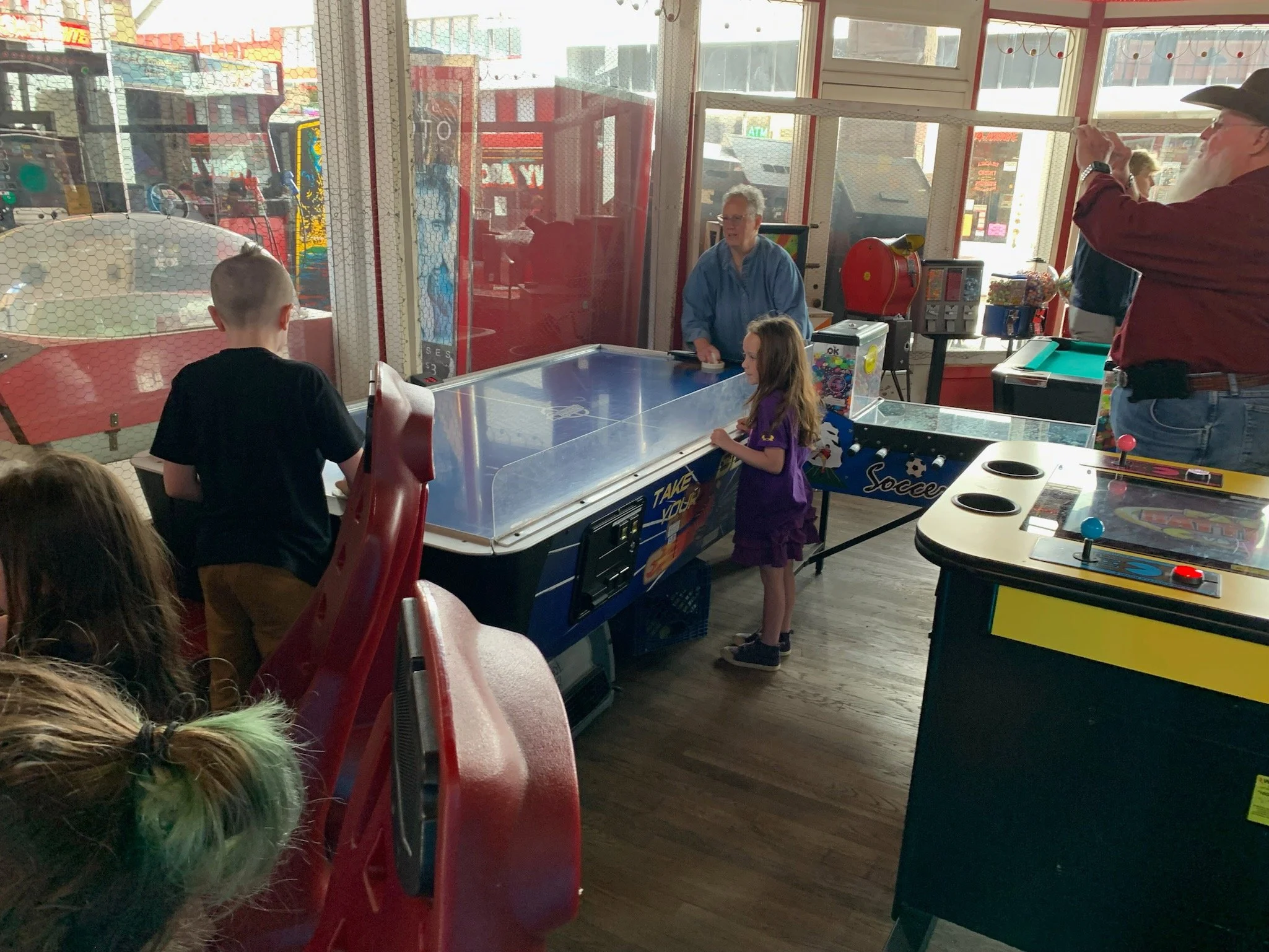 Today we are heading back to Manitou Springs to meet Carissa, Brian, and our four grandchildren, Georgeann, Lachlan, Emmeline, and Ellia. The destination is the Manitou Penny Arcade. Penny is a very gigantic misnomer. It took us both a while to find a place to park but we finally did. We met at the arcade and found an ATM and a change machine. The games take nothing but quarters. We all walked around and the kids tried a few different games, here and there. Ellia seemed to enjoy rides more than games but whatever makes them happy. The biggest hit of the day was air hockey. It started with Grandma playing Lachlan. He was really enjoying it. Grandma told Carissa that maybe they need one for their basement. She replied that Brian was already on it. Then it was time for Grandpa to play Emmeline. Then Georgeann played Ellia. Then we continued to walk around and play games. Eventually it was time to go so the kids were told to choose a last game. A couple of them wanted to play air hockey again.