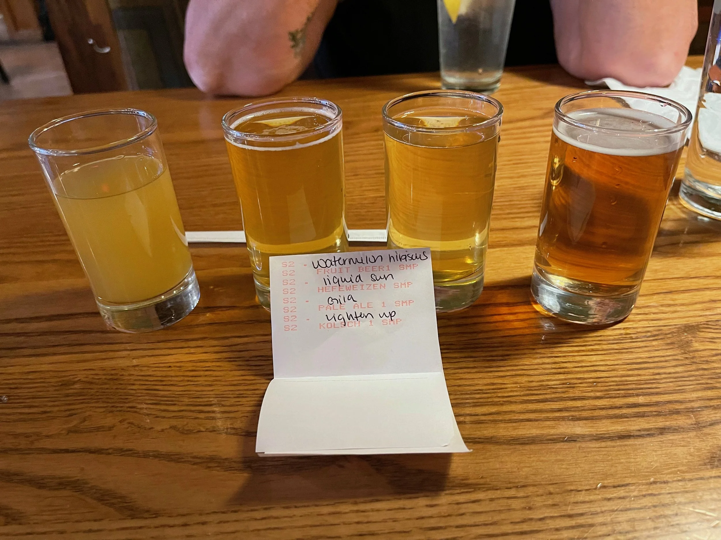 Once in the truck we looked up various restaurants close by. We decided to try Rock Bottom Brewery. My flight here consisted of a Watermelon Hibiscus Blonde, Liquid Sun, Gila Pale Ale, and Lighten Up! Kolsch. They were good. The Watermelon Hibiscus Blonde was only okay. It sounded better to me than it tasted. Nancy ordered a Cheesesteak sandwich and I ordered the Brisket sandwich. We thought we would each eat 1/2 of our order and then try the other 1/2 of the other one. Nancy didn’t care for the BBQ sauce on the brisket sandwich so I only had a bite of the cheesesteak. It was okay, a little dry for me. I thoroughly enjoyed the brisket sandwich.