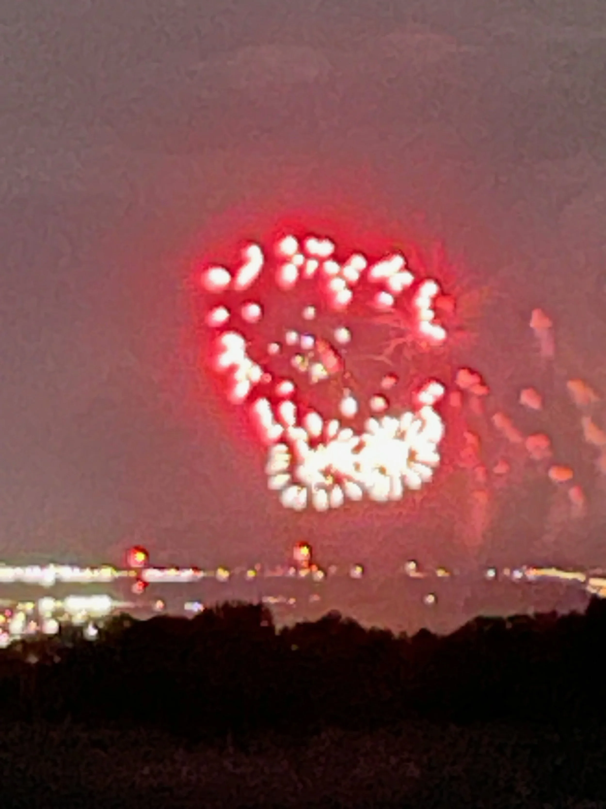 When we finished our clean up for the day I put some dry wood in our fire pit. Don’t know why but we have a lid that fits over the fire pit. This lid will keep the wood dry in case it should rain, as a little rain is being called for in the early afternoon. Sure enough around 1:00 PM the rains came. Naturally this would slow the gate down a little. But then an hour or so later, the sun was out again. The radar showed clear skies. Around 4:00 PM I went out and started a campfire. I had decided that tonight we would cook outside over the grill and enjoy s’mores during the fireworks. We had taken steaks out of the freezer several days ago so they needed to be cooked. Bree and I sat outside after starting the fire and I was enjoying a cup of coffee. Rough life, huh? Then I heard the rumble of thunder. I threw another log on the fire and hoped I could get dinner cooked before the next rain. Once Nancy came home I put the steaks on our tripod. The tripod is something left over from our early tent days. It is a tripod with a grate that you set up over a campfire to cook on. It is wonderful. I also decided to cook up some potatoes with onions and peppers. So I put those in a cast iron skillet and set those to the side over the campfire on the fire pit grate. The thunder rumbled more and the sky darkened. I managed to get dinner cooked and then I covered the dry wood and added another log to the fire to see if I could get it to stay hot enough for s’mores.
