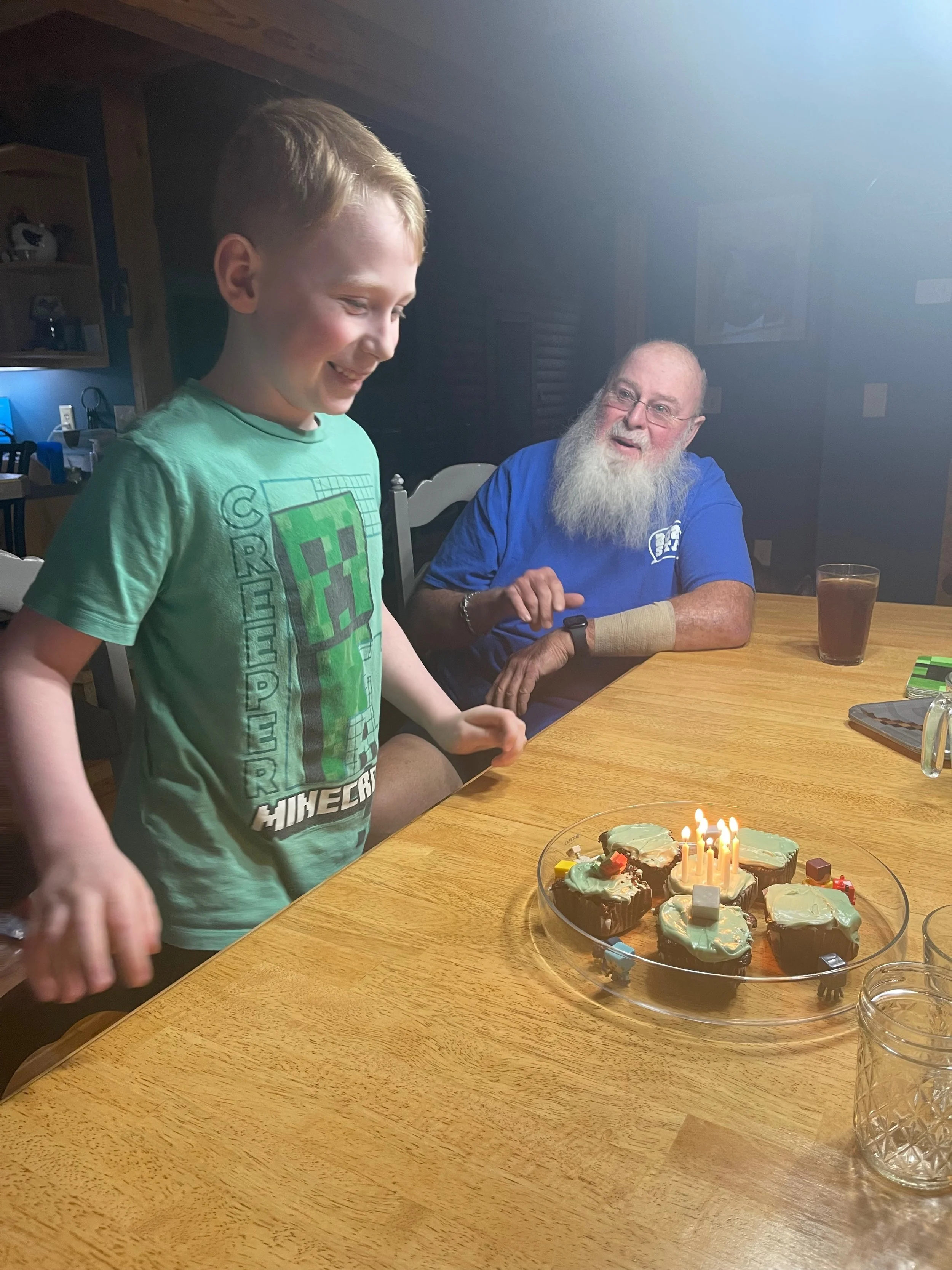 When we arrived home, Phillip had Braxton out in the front yard playing. He did not know we were coming home. He was very surprised. The smile on his face and in his eyes said it all. And then the wonderful hugs we got from everyone. Phillip backed the RV into the drive while Nancy and I went inside to get hugs and say hi to Andrew and Michelle. Then I went back out and Phillip and I unhitched the RV and set it up. The long process of moving back into our little cottage began. Since we rented it out while we were gone, almost everything went into storage or packed into a closet. It will be several days to get everything where it belongs. The RV needs a deep cleaning in and out. There are a couple of minor repair items to do. We have until mid September to get it ready for a one week trip to Wilkesboro, NC to see some of our RV friends. The RV has logged 8,855 miles in the last one year, 3 months, and 4 days. While the trip was definitely worth taking and quite the adventure and experience, It’s still good to be home. Phillip and Michelle made a wonderful dinner for us. Smoked beef tenderloin, doctored green beans (bacon and onions), sautéed mushrooms, smoked shrimp, and for desert peanut butter pie. It was fabulous! And greatly appreciated. And we are definitely in time for Braxton’s 8th birthday.