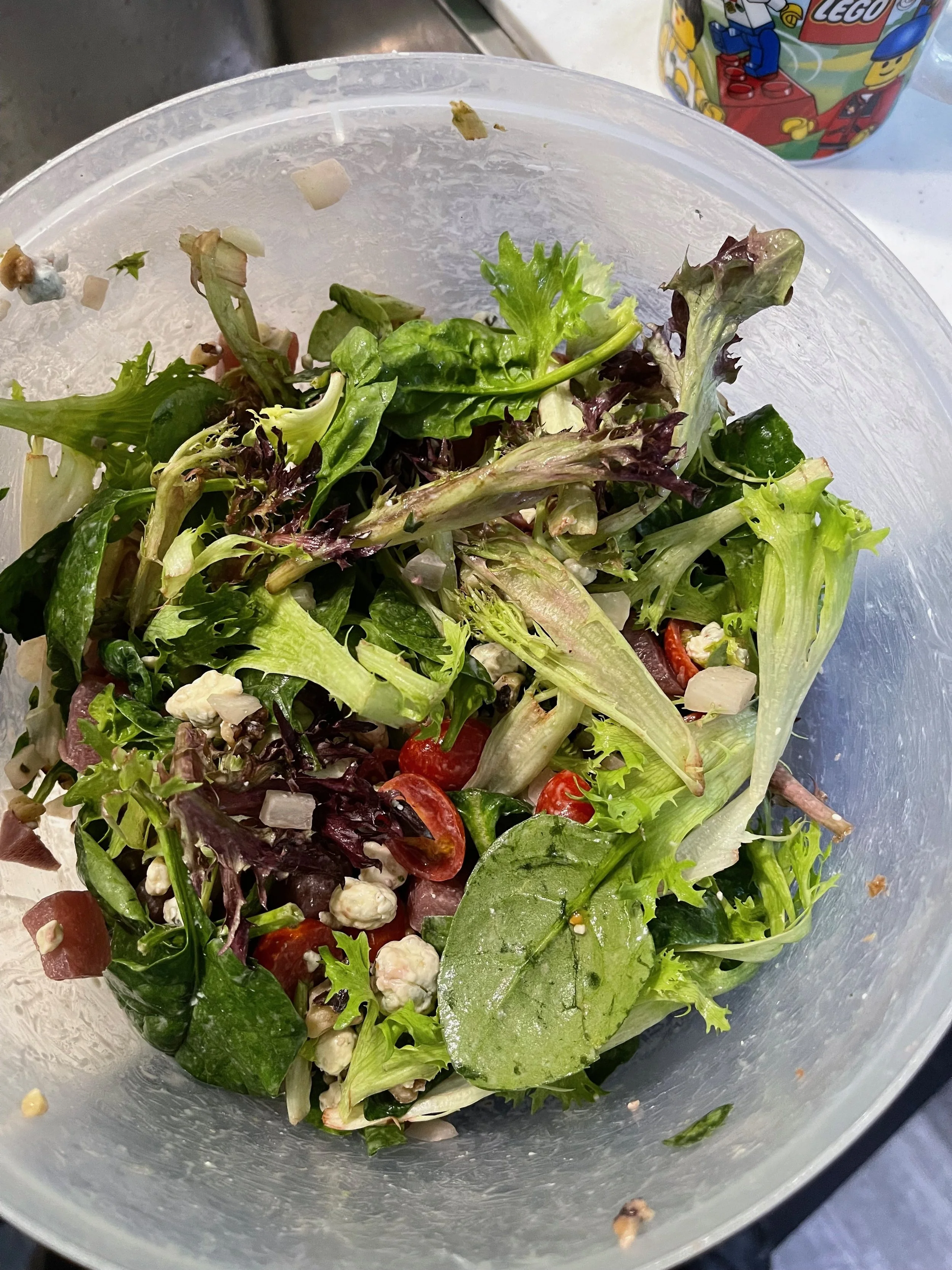Friday 2/9 we had plans to go to Chris and Jim’s for dinner and games. We opted to bring a salad. They were fixing a Parmesan Meatloaf, made from ground chicken and some steak fajitas. I am not a big fan of ground chicken or turkey but the meatloaf was good. I wanted to do a fancy salad, so I decided to do one I remembered from when I worked at DeValleta, a poached pear salad. The salad is a combination of 50/50 mix of spring greens and spinach, halved cherry tomatoes, crushed walnuts, sweet diced onion, and bleu cheese and the poached pears. The pears were poached in a port wine. It turned out very good. After dinner we played Rummy Cube.